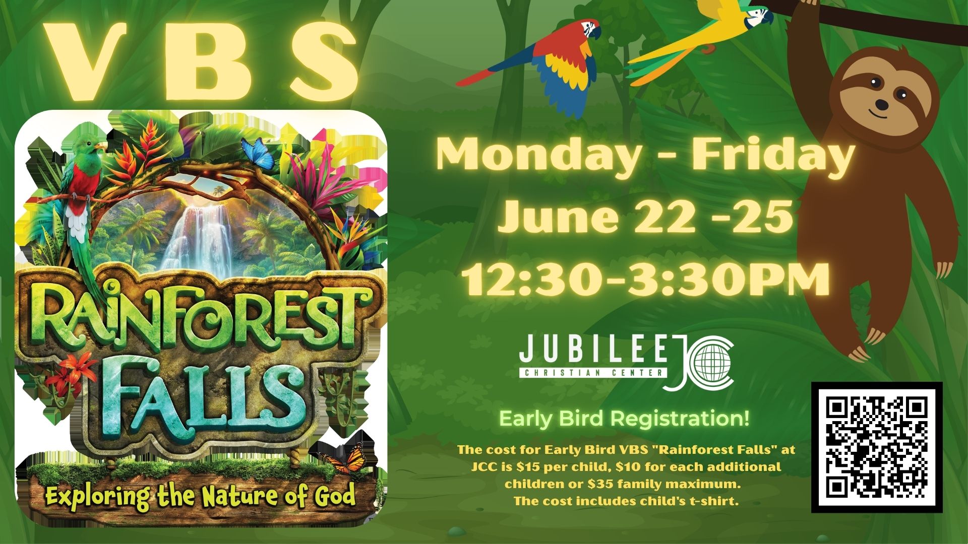 The cost for Early Bird VBS "Rainforest Falls" at JCC is $15 per child, $10 for each additional child or $35 family maximum. The cost includes child's t-shirt. As of May 1 the cost will be $20 per child, $15 for each additional child or $40 maximum. Also includes the t-shirt.
